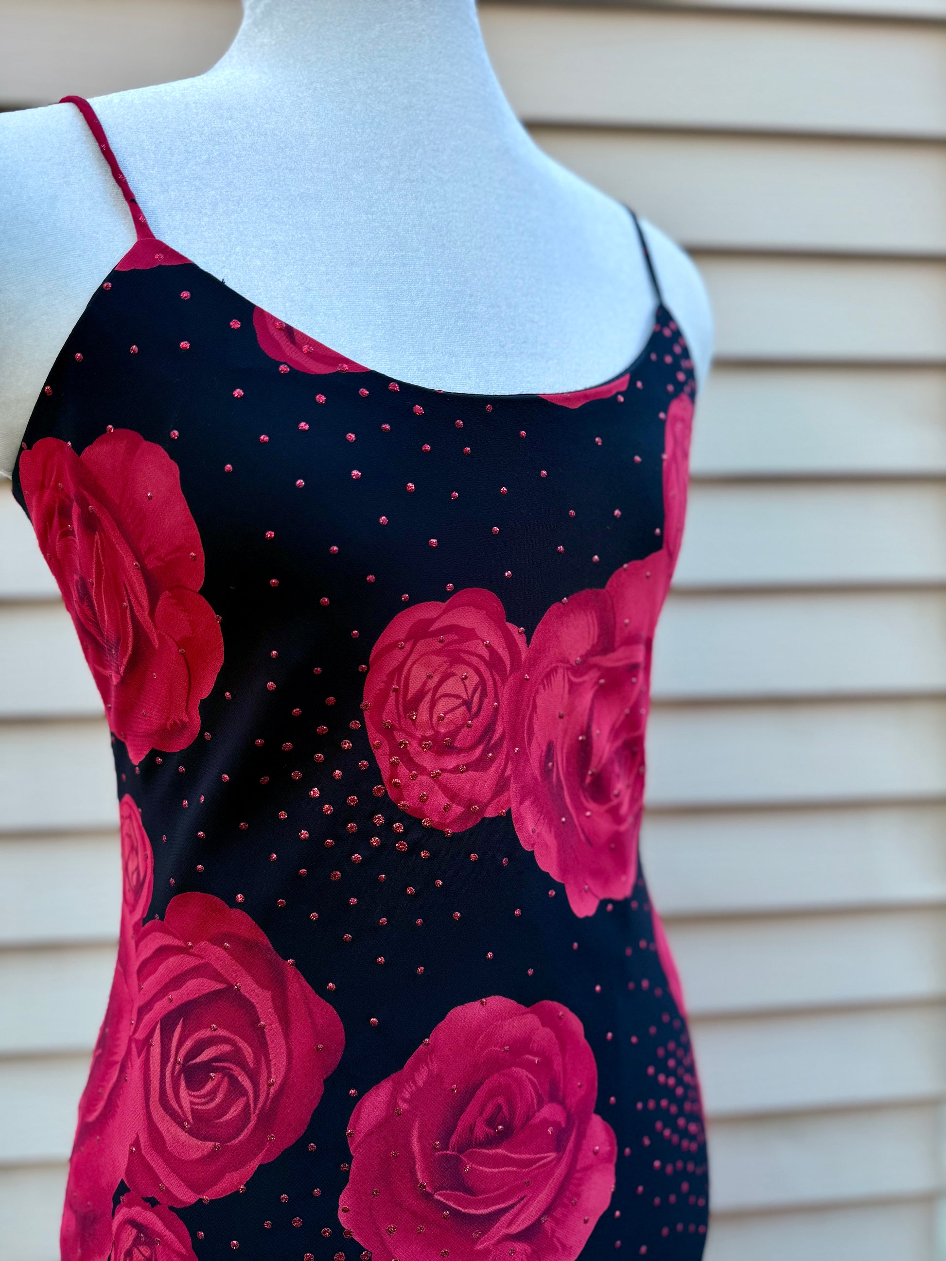 a 90s midi, flowy slip dress featuring allover rose print and subtle glitter details on mesh overlay.