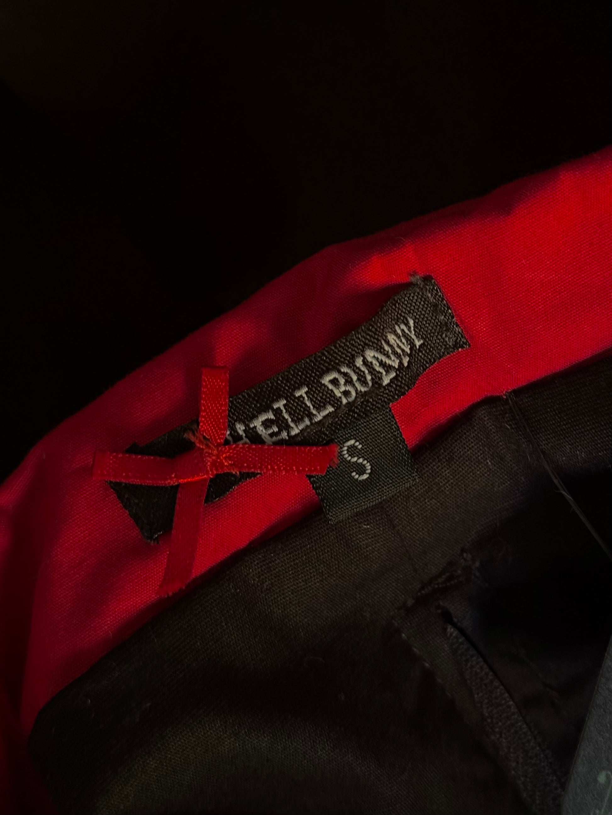 a vintage Hell Bunny retro black a-line midi dress with contrast waist, collar, and cuffs.