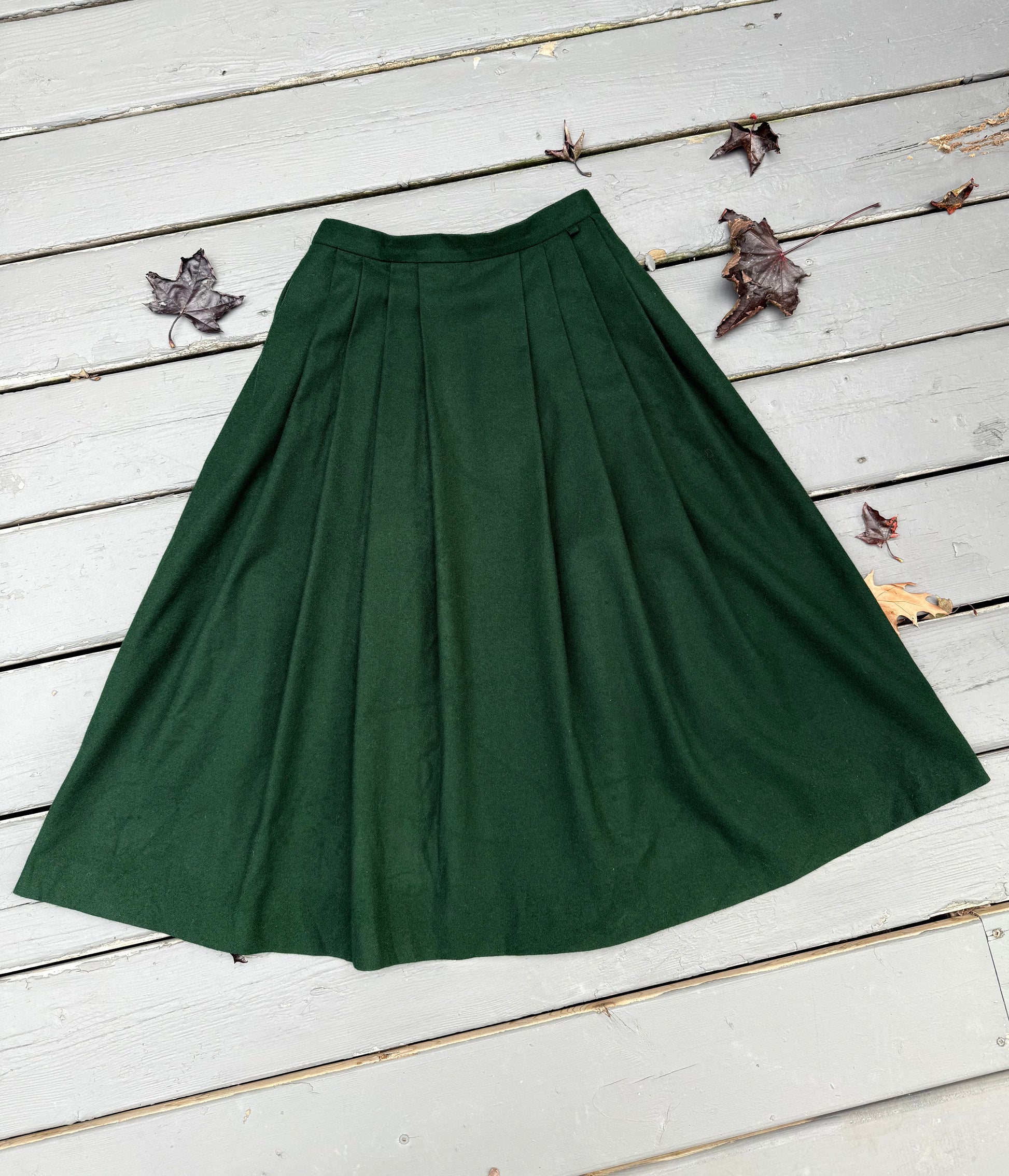a vintage, pure wool pleated midi skirt with a-line silhouette in a beautiful deep forest green.