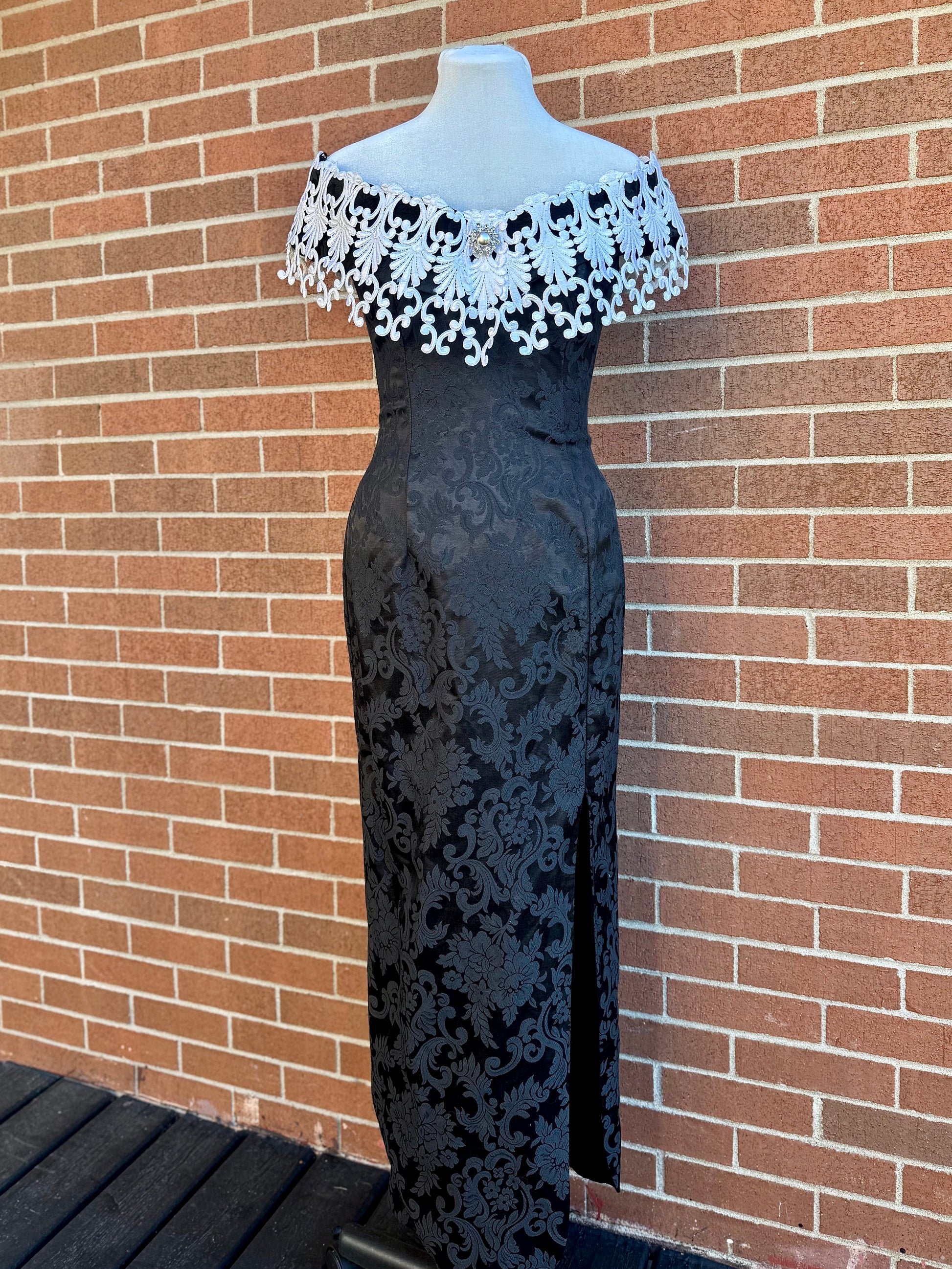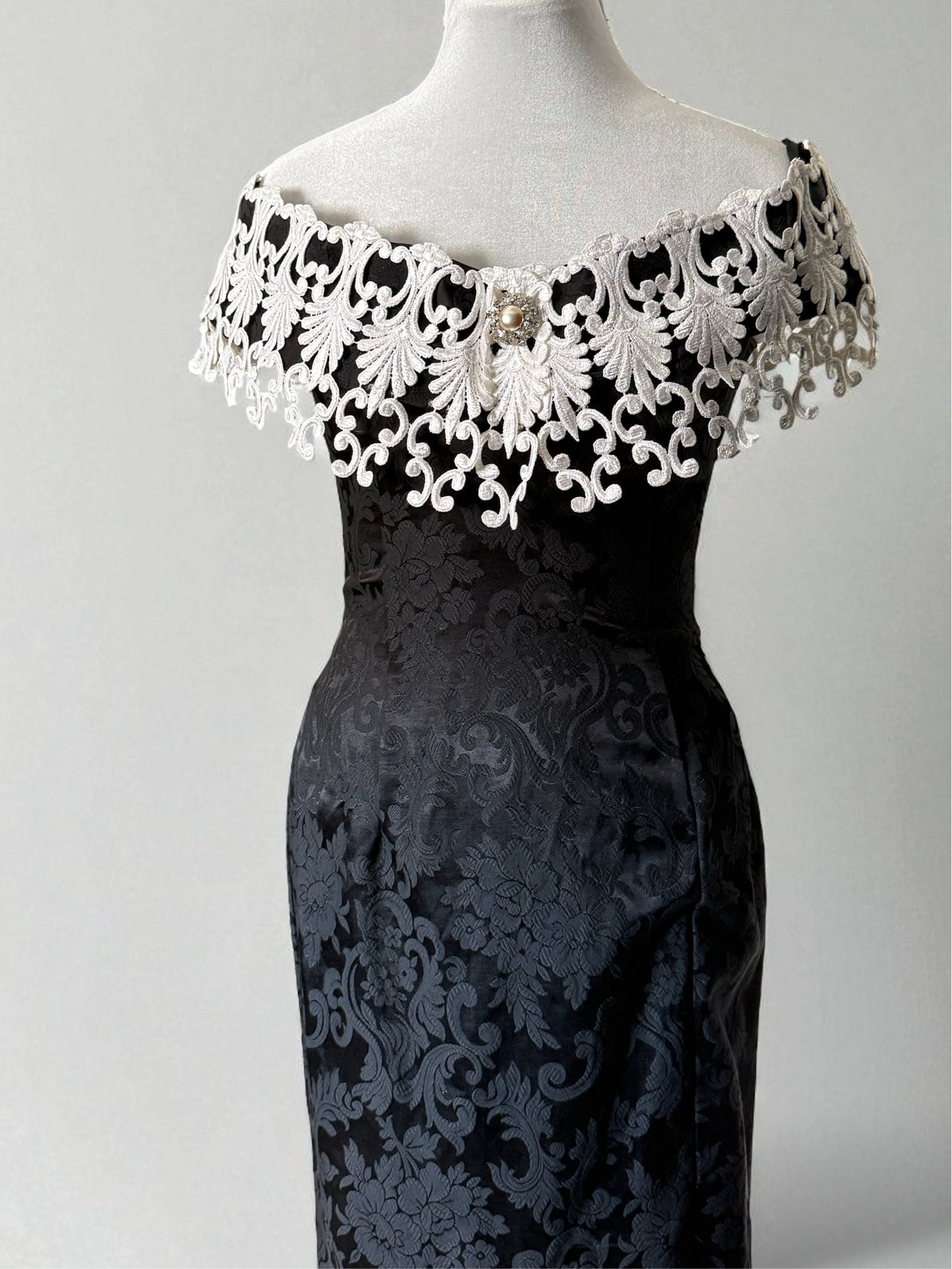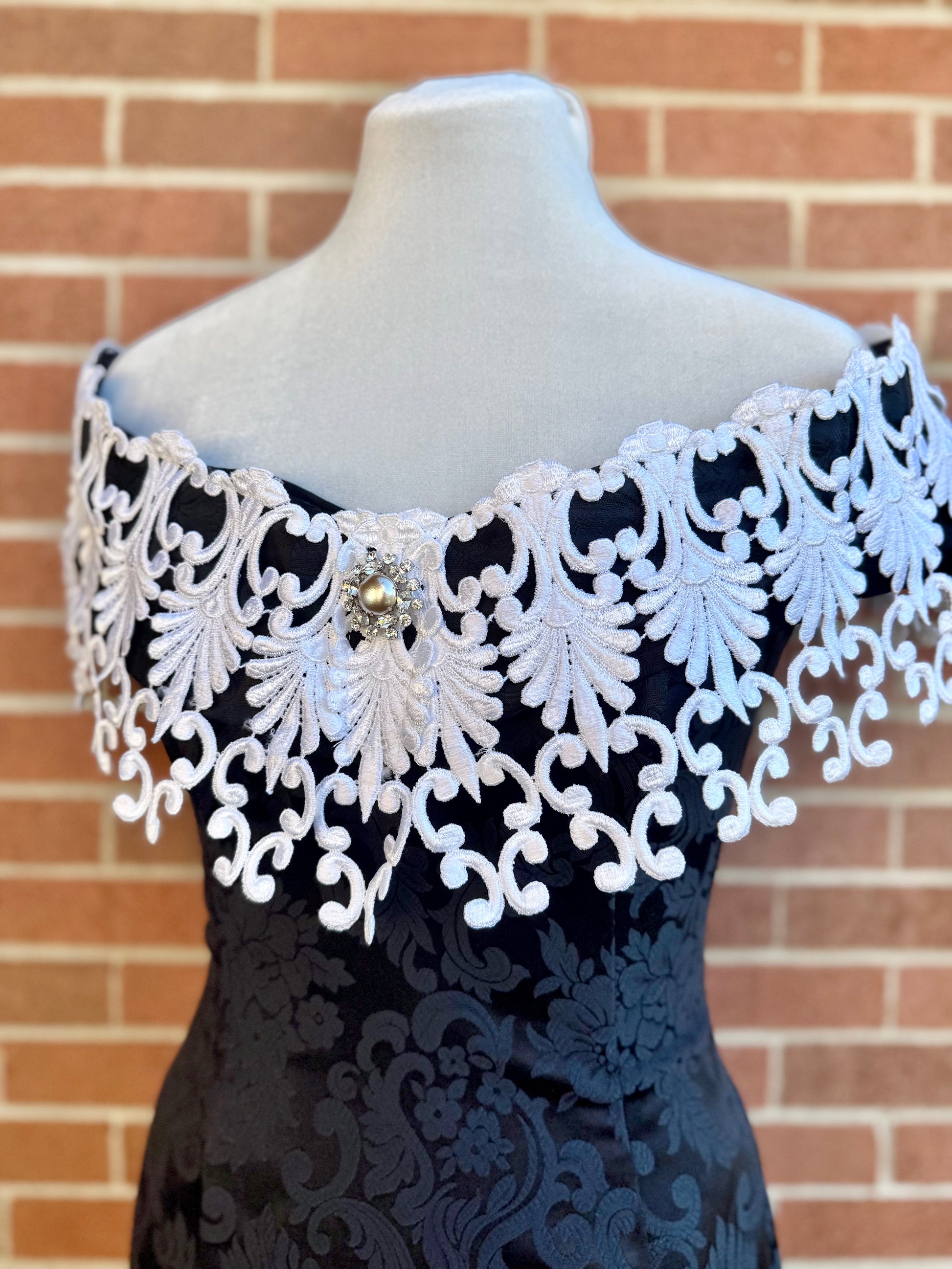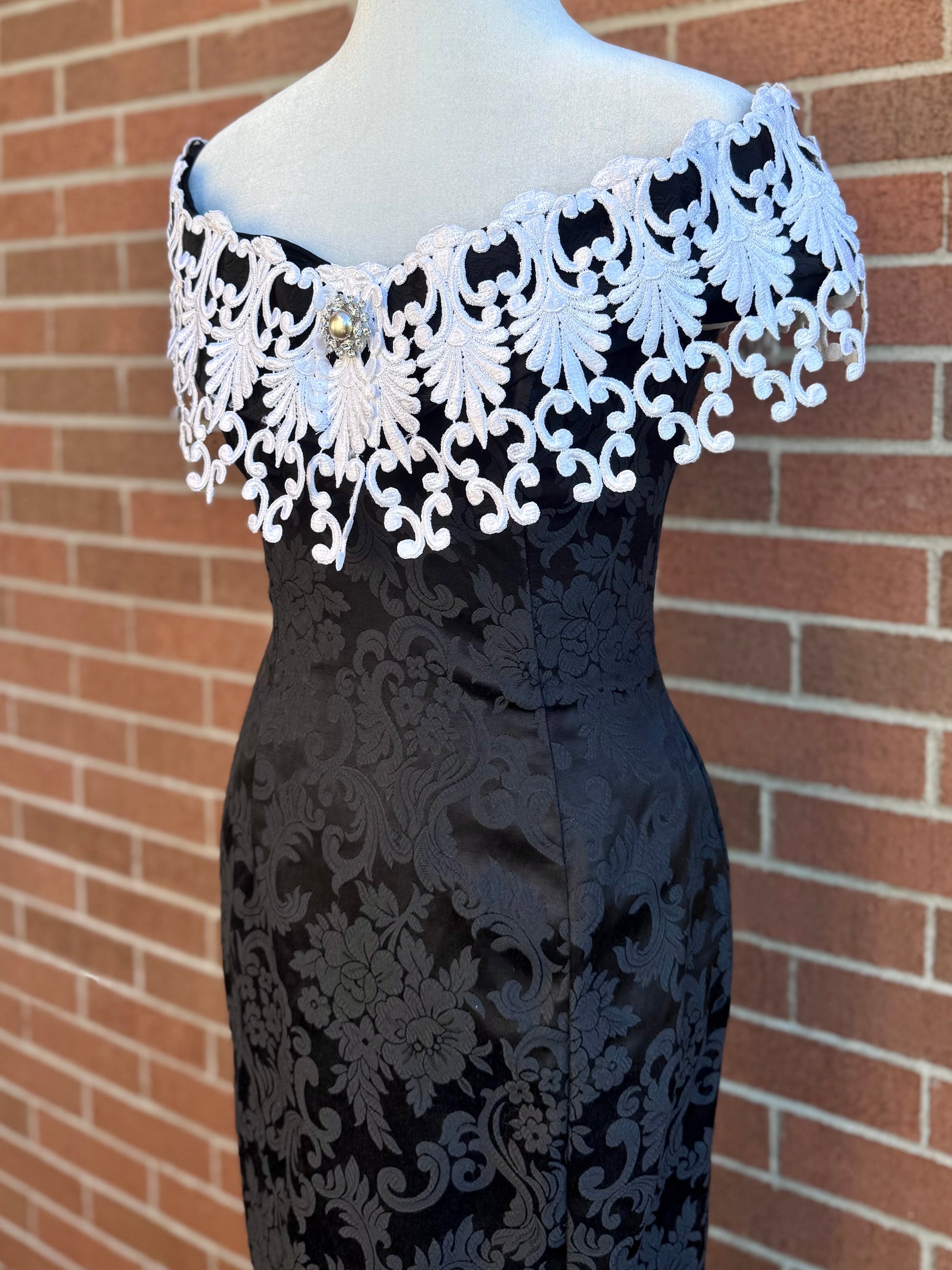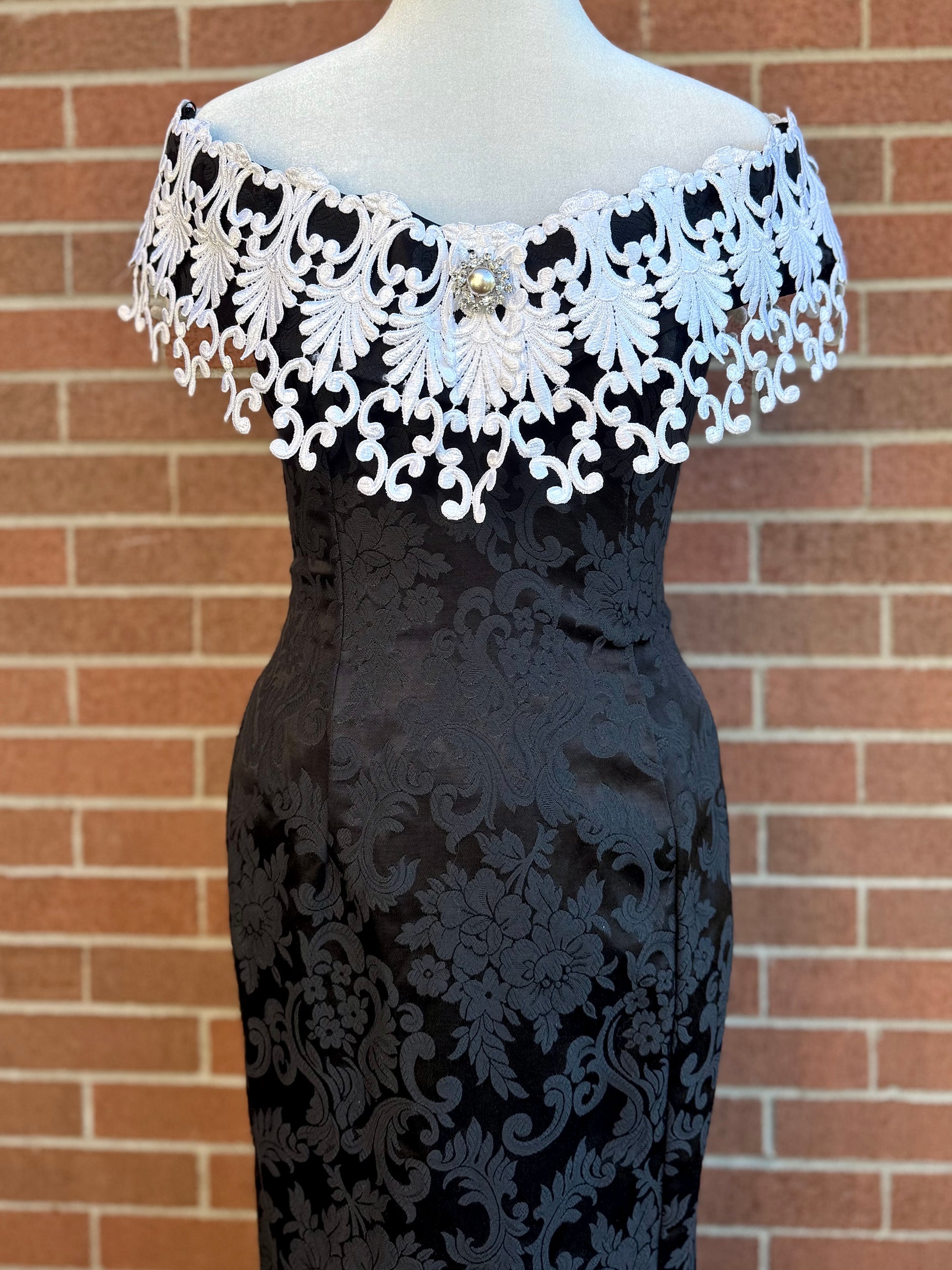 a truly regal gothic gown by scott mcclintock, featuring allover black jacquard fabric with damask pattern, flexible boned corset bodice, and overstated off-the-shoulder lace neckline with faux pearl and rhinestone detail. elasticized shoulder pieces to keep it in place. be the vampy belle of the ball in this unique vintage piece!
