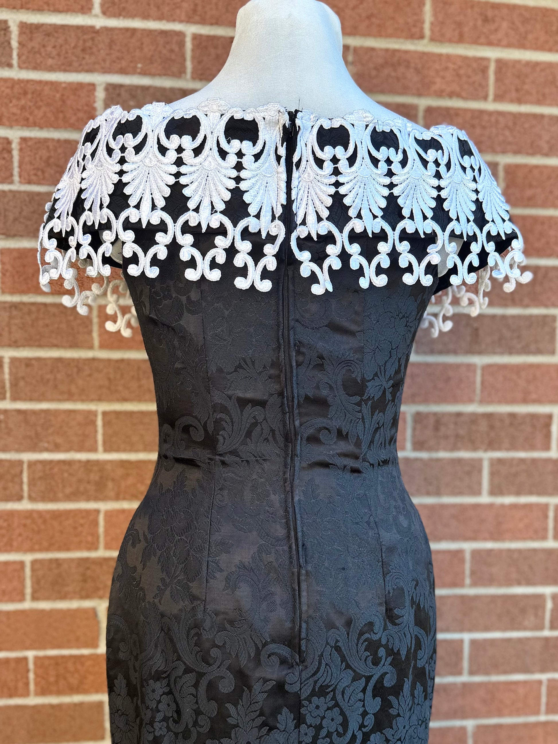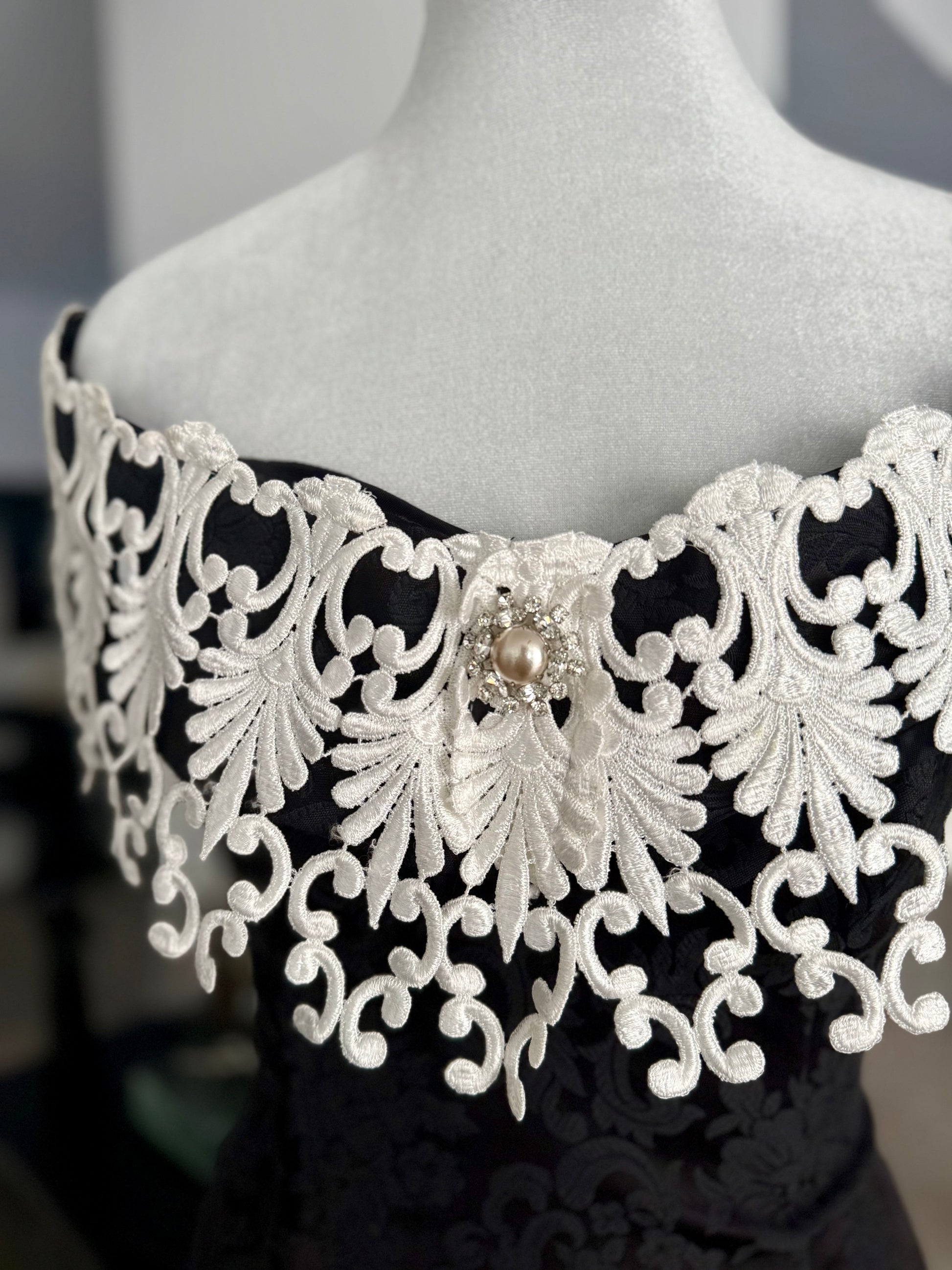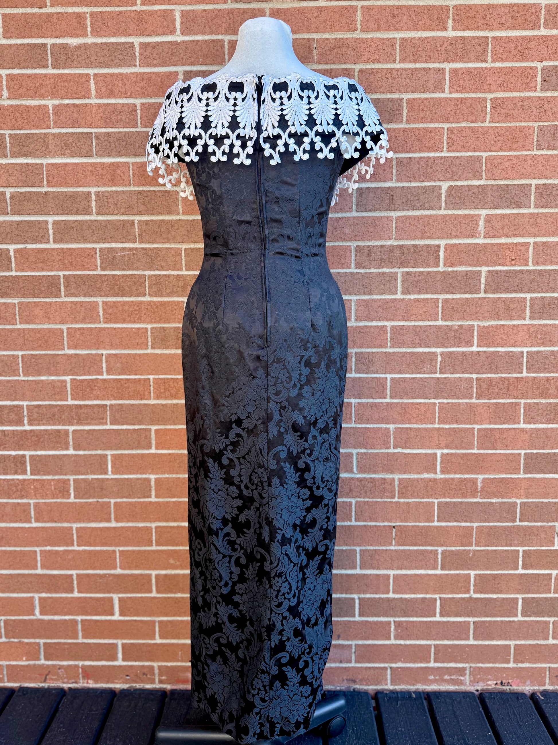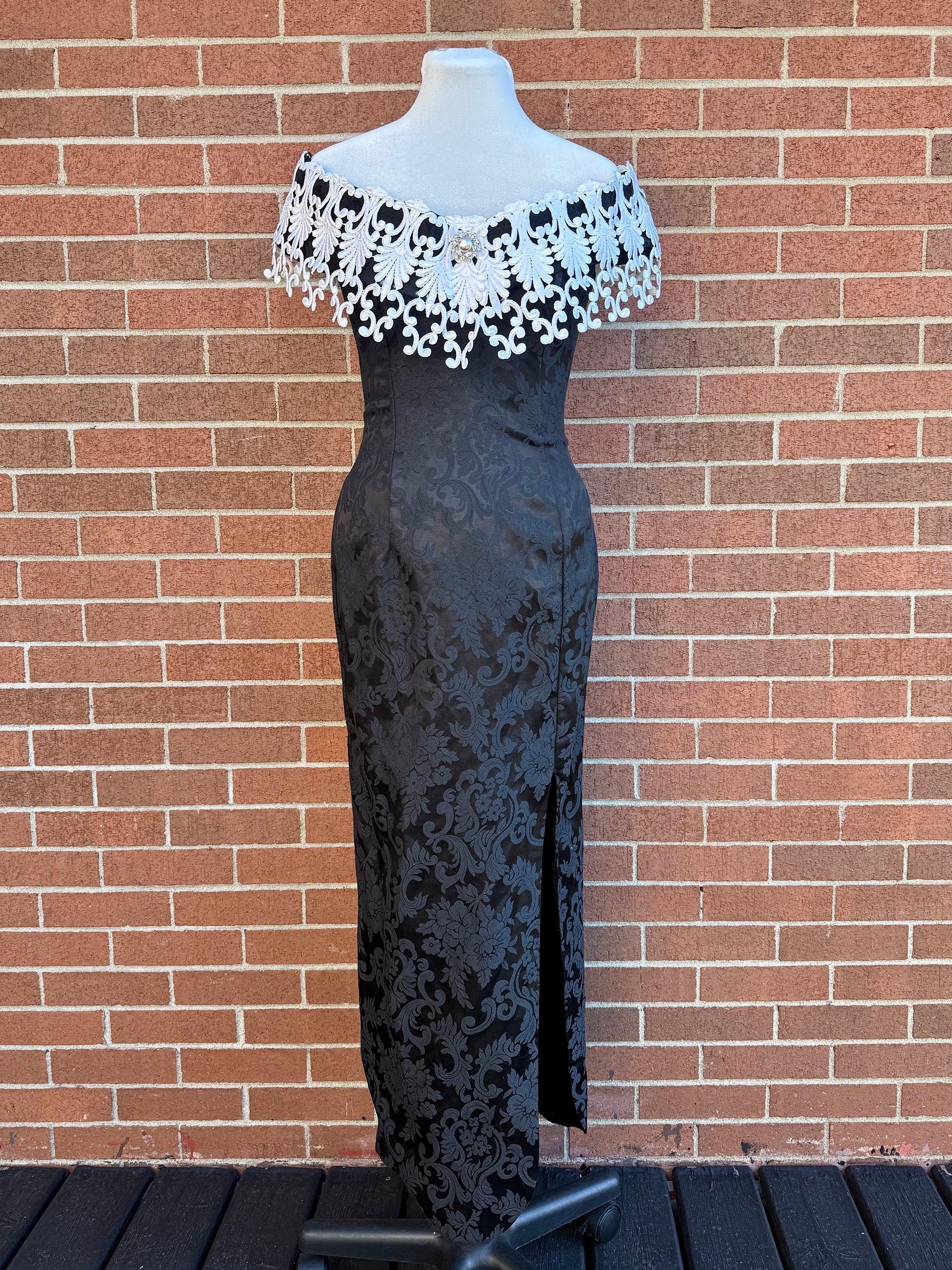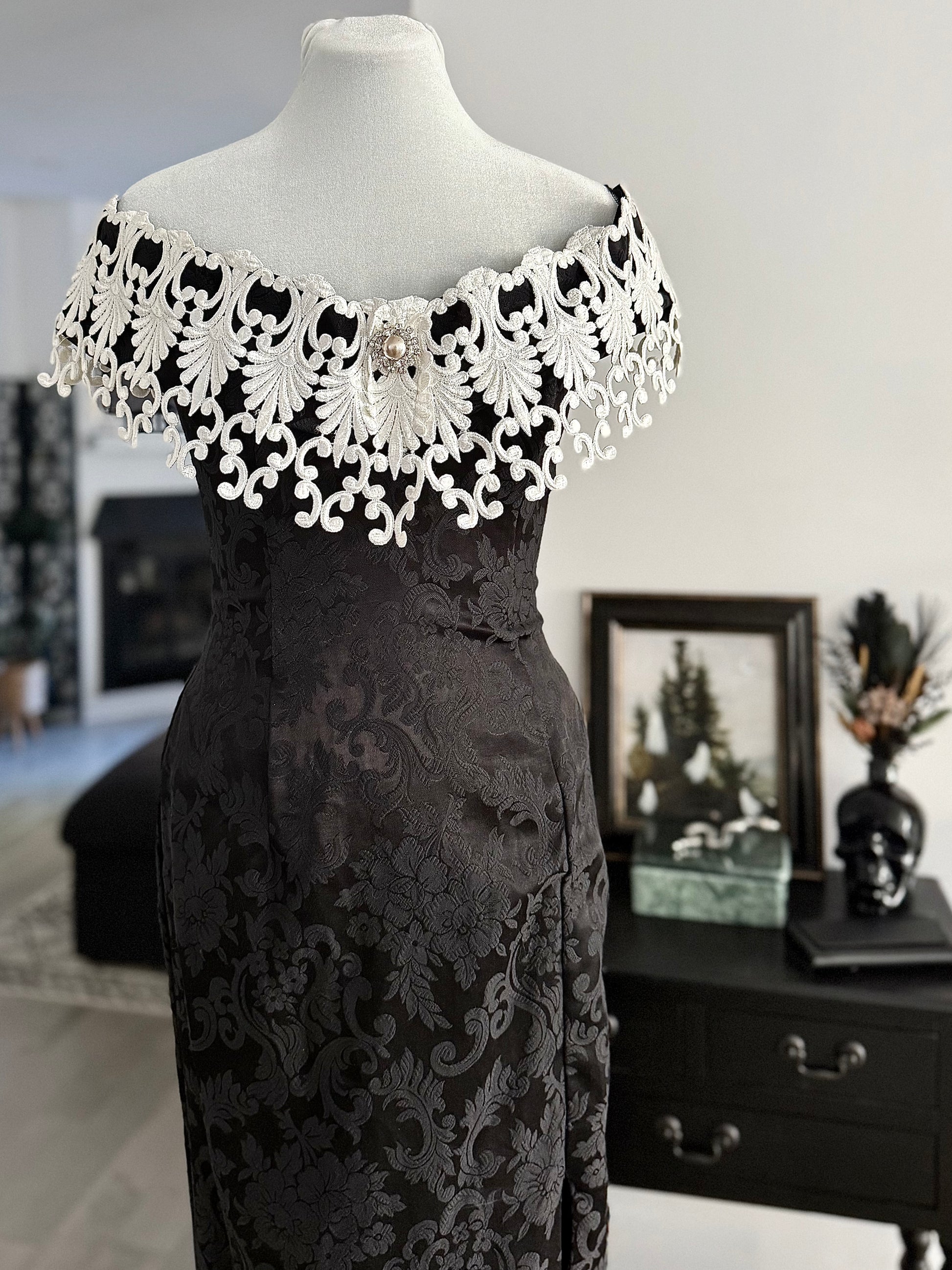a truly regal gothic gown by scott mcclintock, featuring allover black jacquard fabric with damask pattern, flexible boned corset bodice, and overstated off-the-shoulder lace neckline with faux pearl and rhinestone detail. elasticized shoulder pieces to keep it in place. be the vampy belle of the ball in this unique vintage piece!