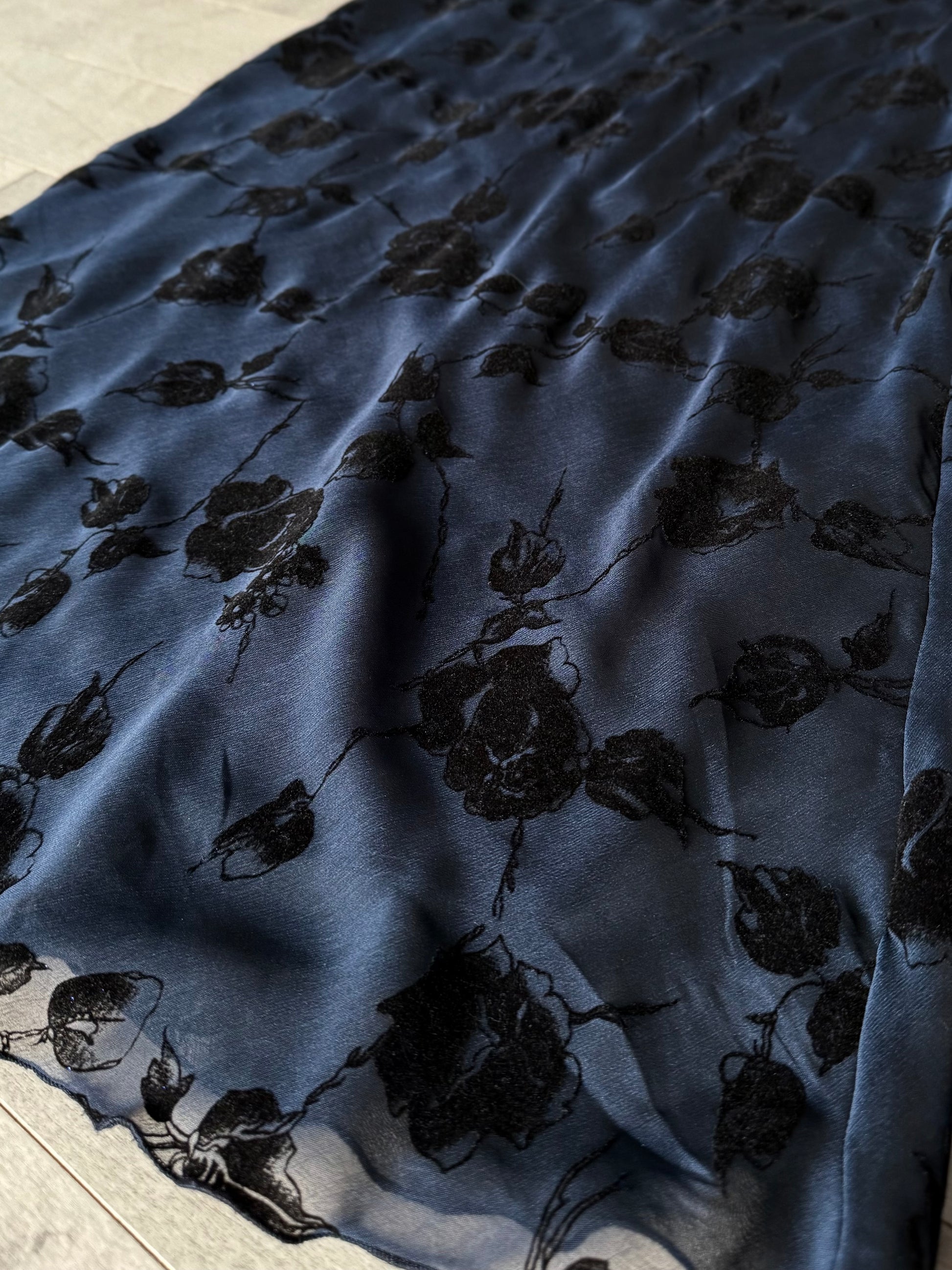 a light and silky midi dress with cowl neckline and allover flocked velvet roses and subtle sparkle.