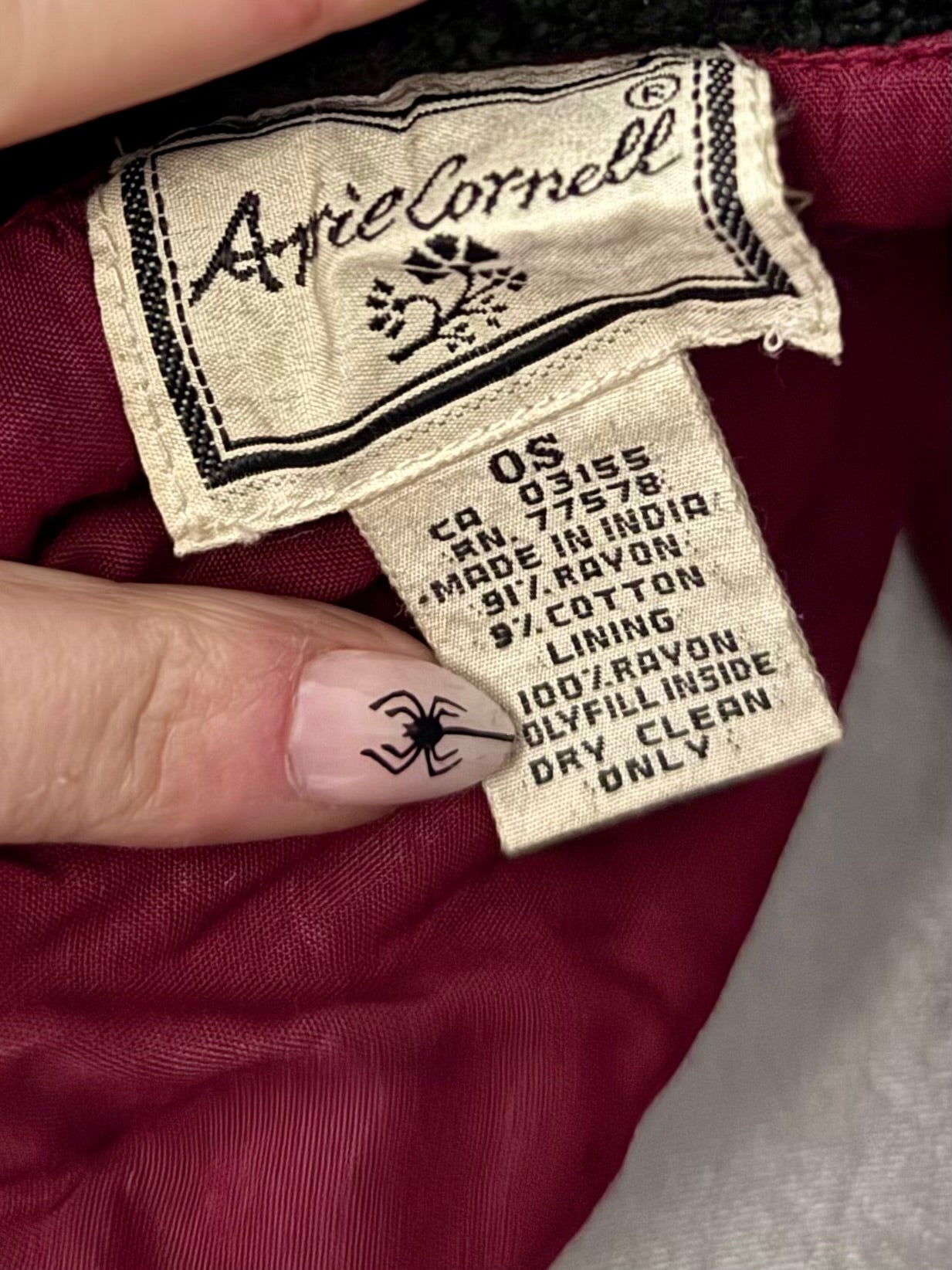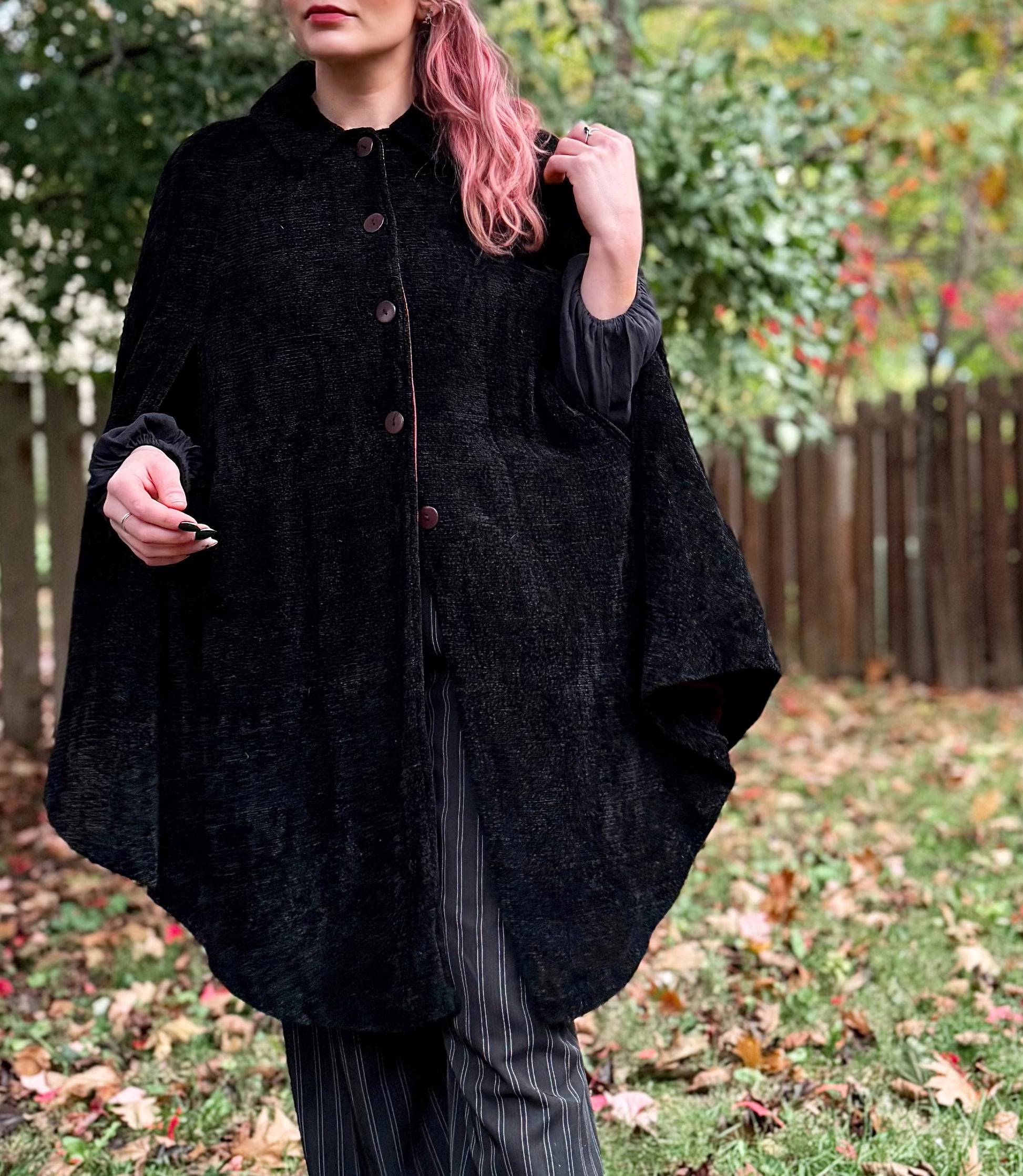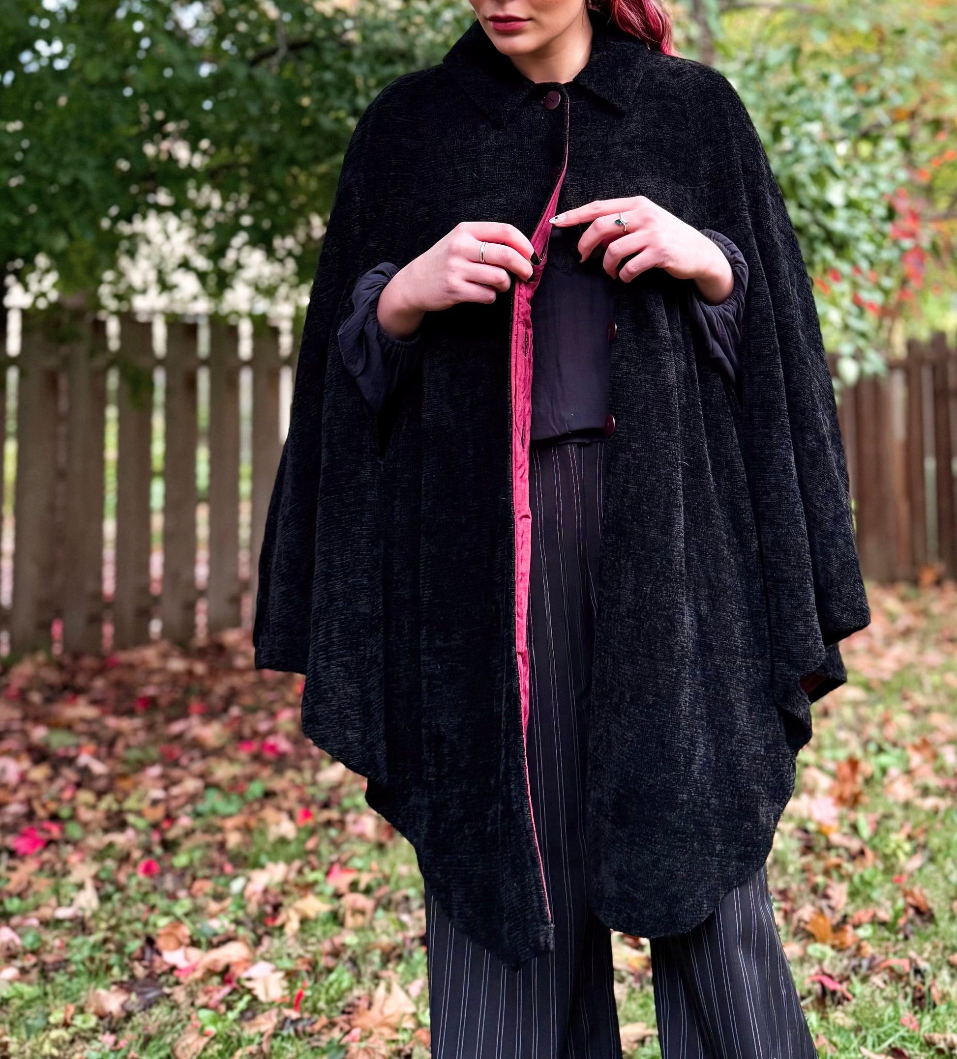 an incredible, heavy, super soft vintage cape by april cornell, featuring a silky deep cherry red lining, full button front, soft chenille exterior, hidden inner pockets, and arm slits.