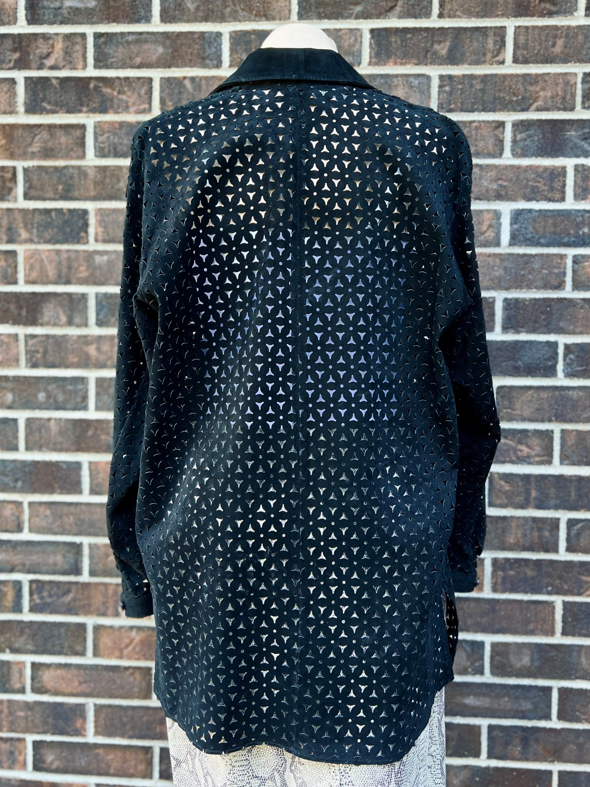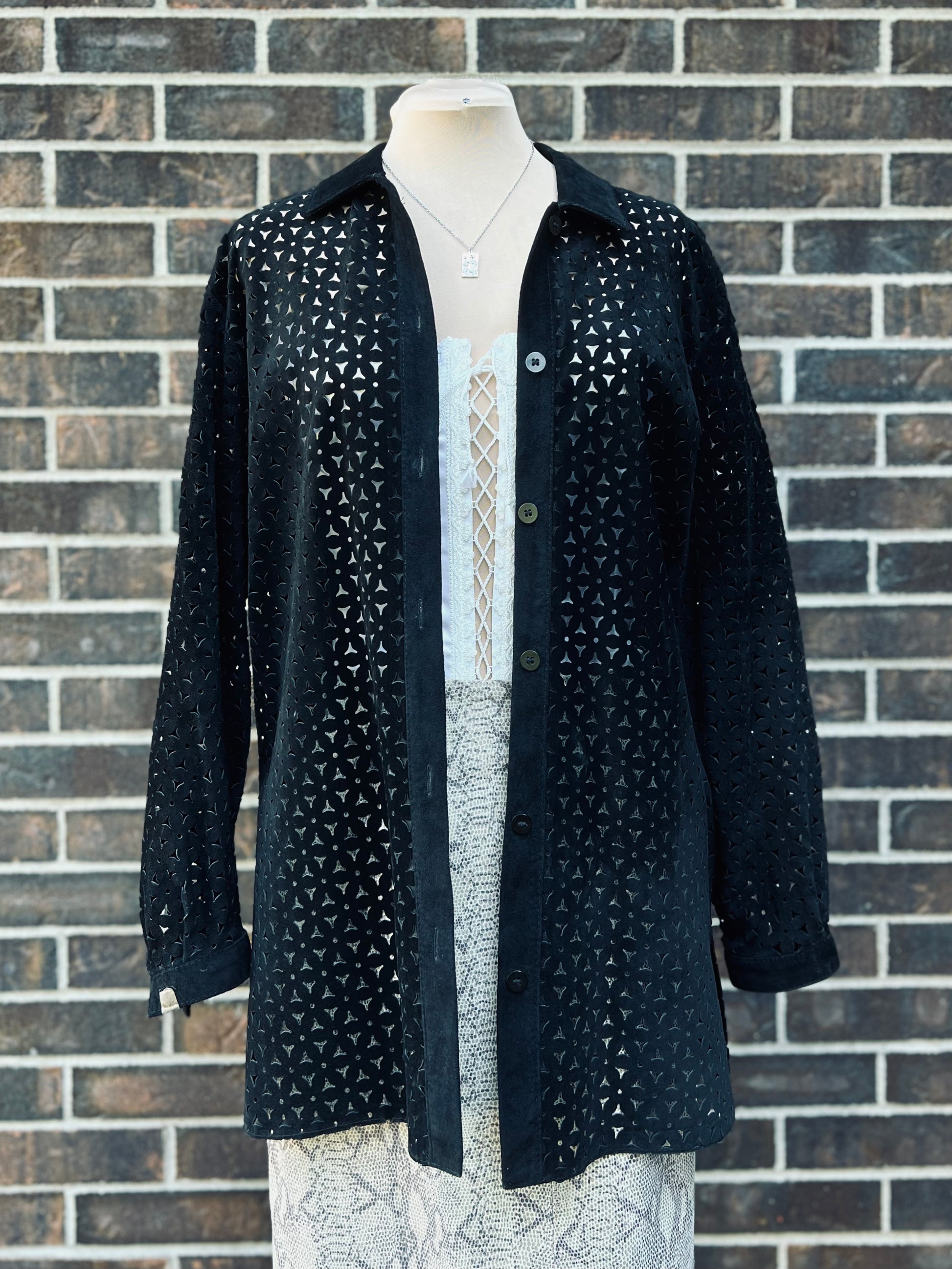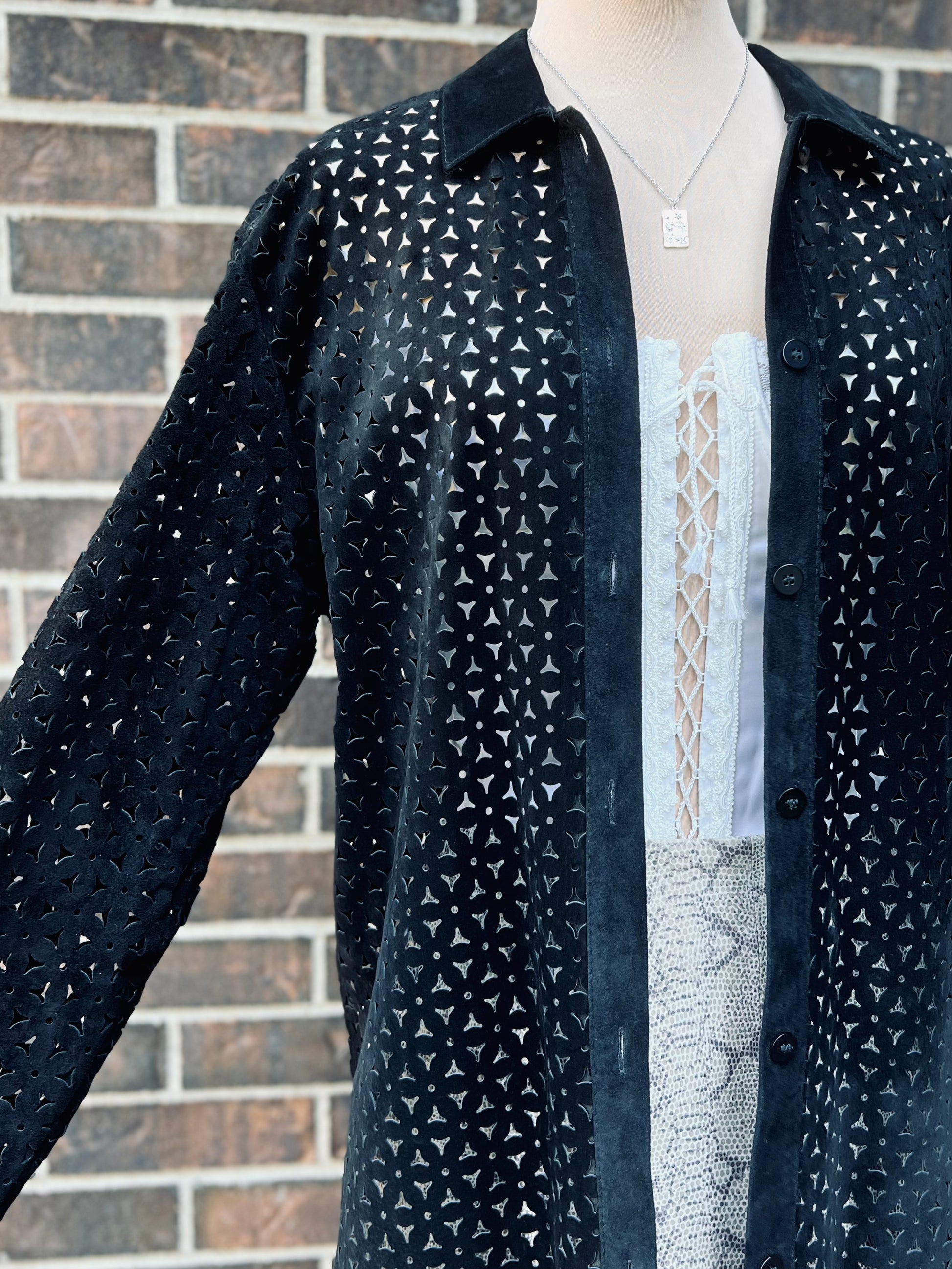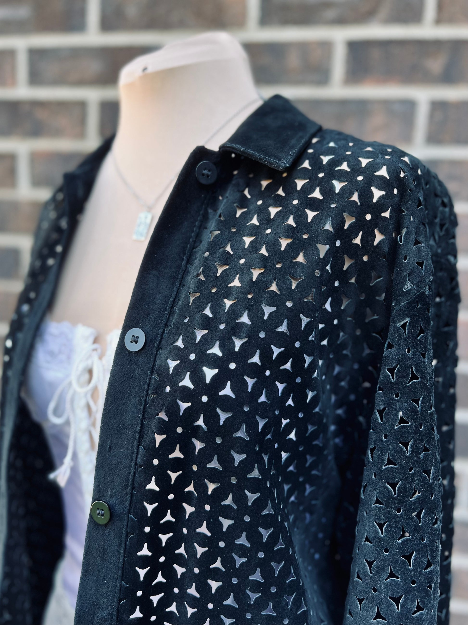 nothing beats this vintage danier black suede shirt jacket with allover geometric laser cut outs! oversized slouchy fit with button up front, the lightweight unlined genuine suede piece can be thrown over any outfit to make a badass statement.