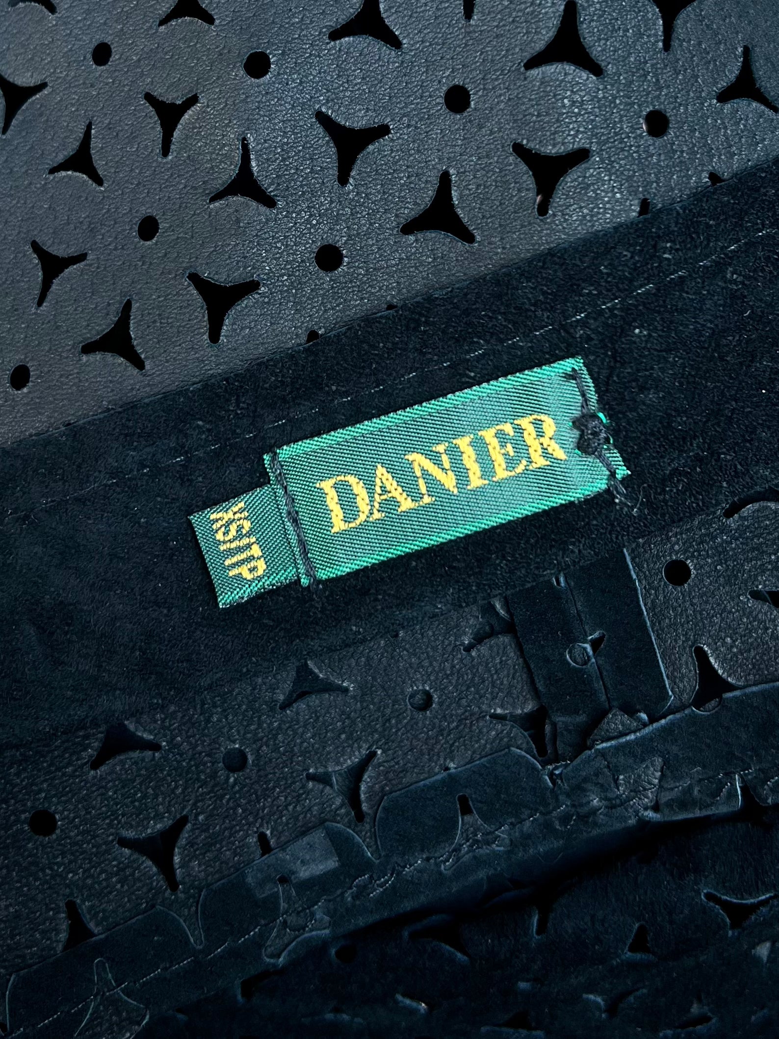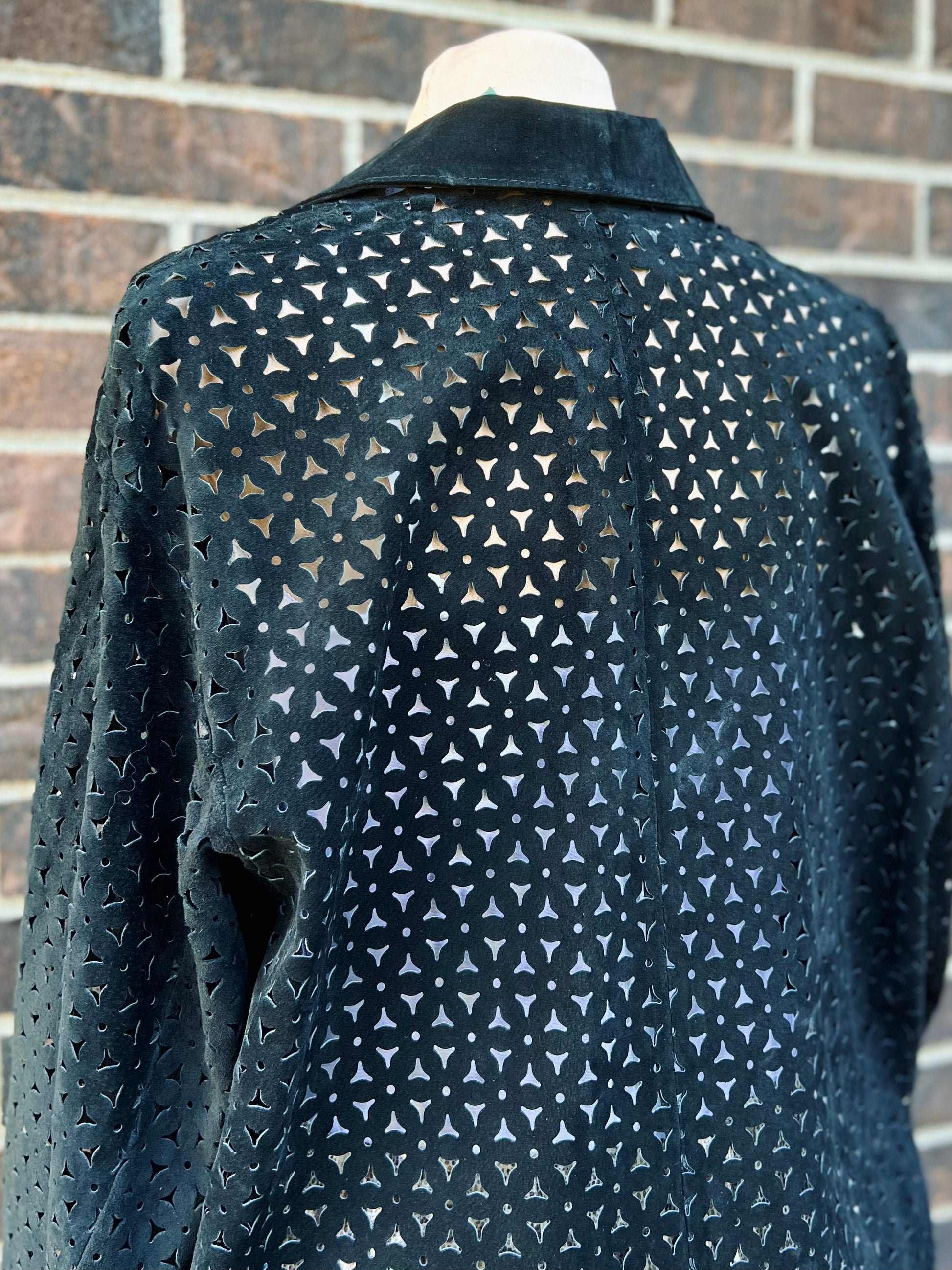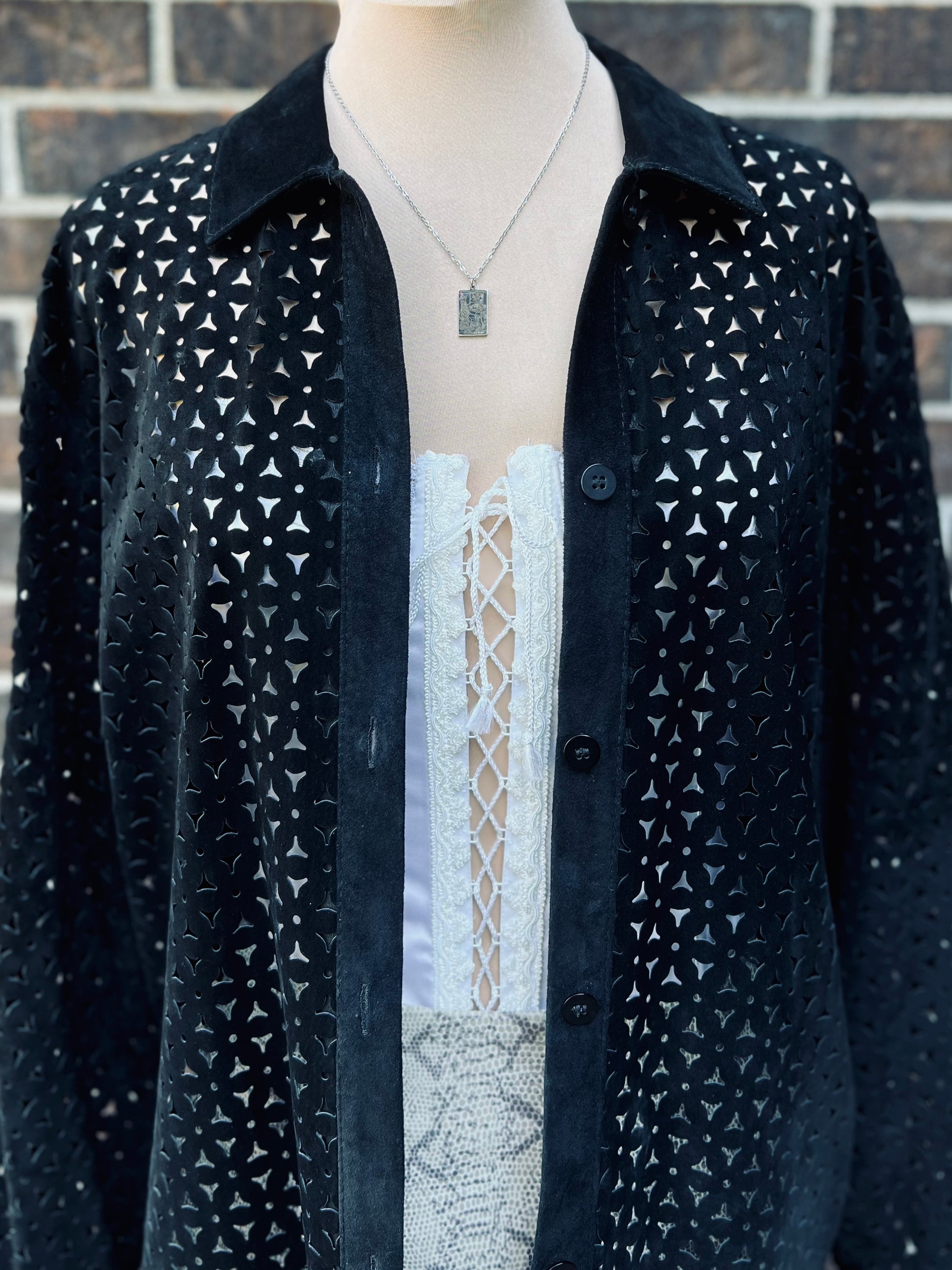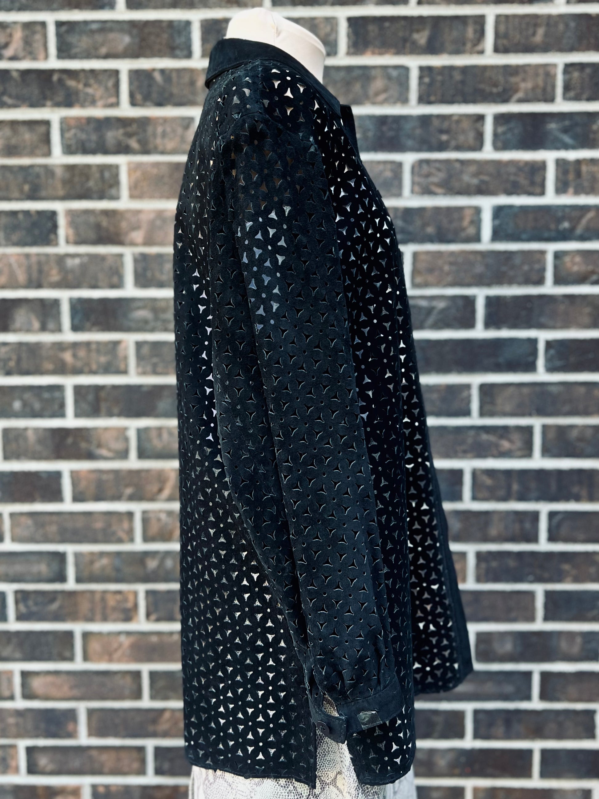 nothing beats this vintage danier black suede shirt jacket with allover geometric laser cut outs! oversized slouchy fit with button up front, the lightweight unlined genuine suede piece can be thrown over any outfit to make a badass statement.