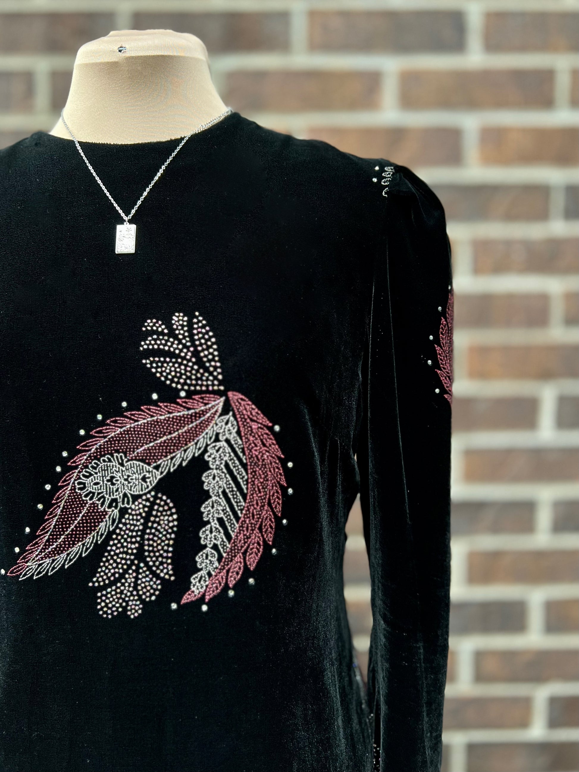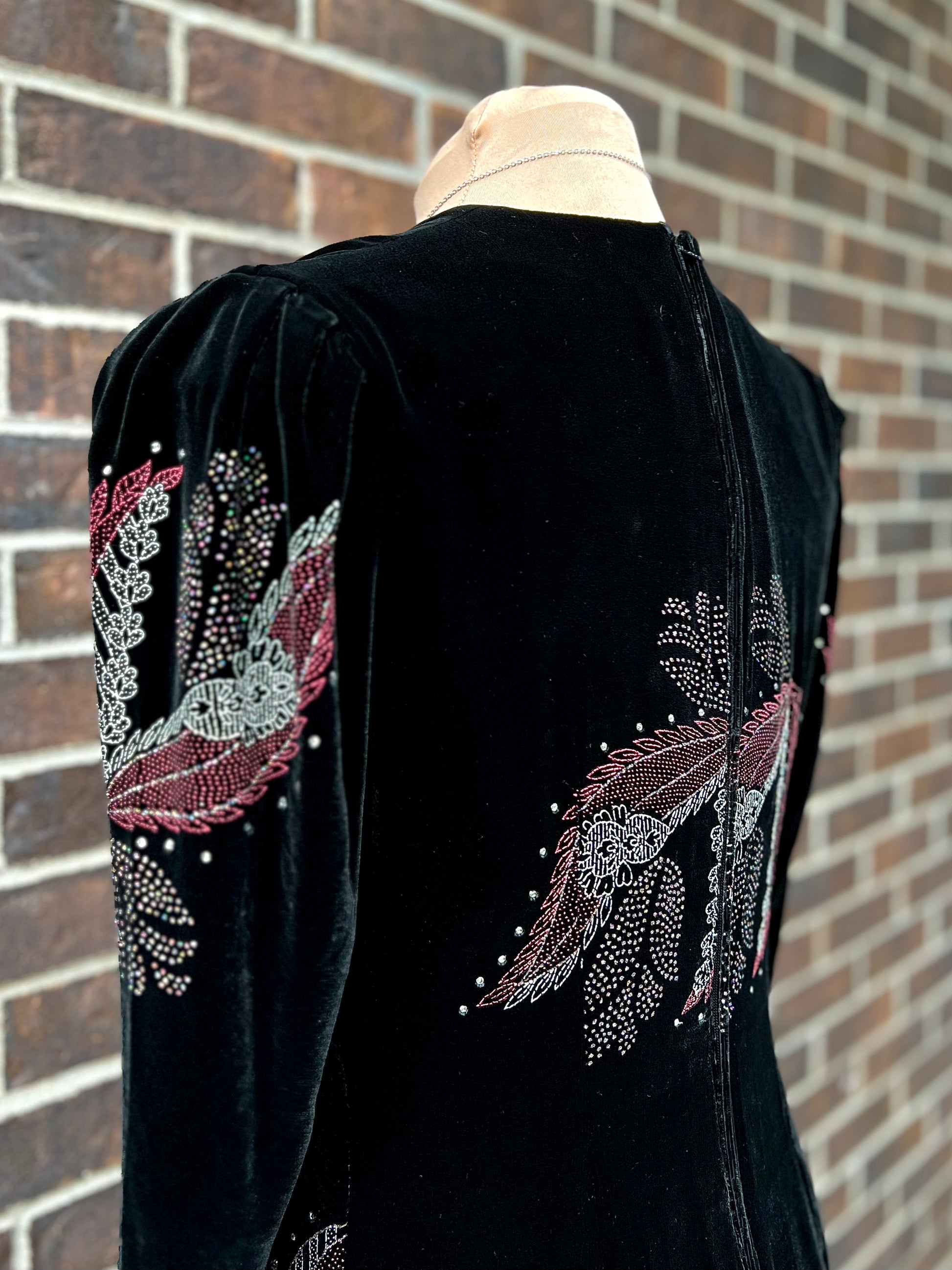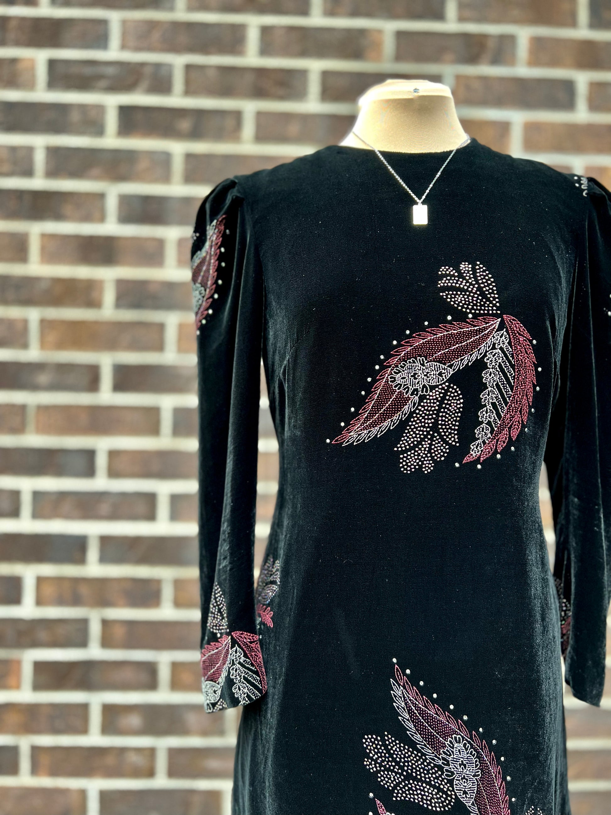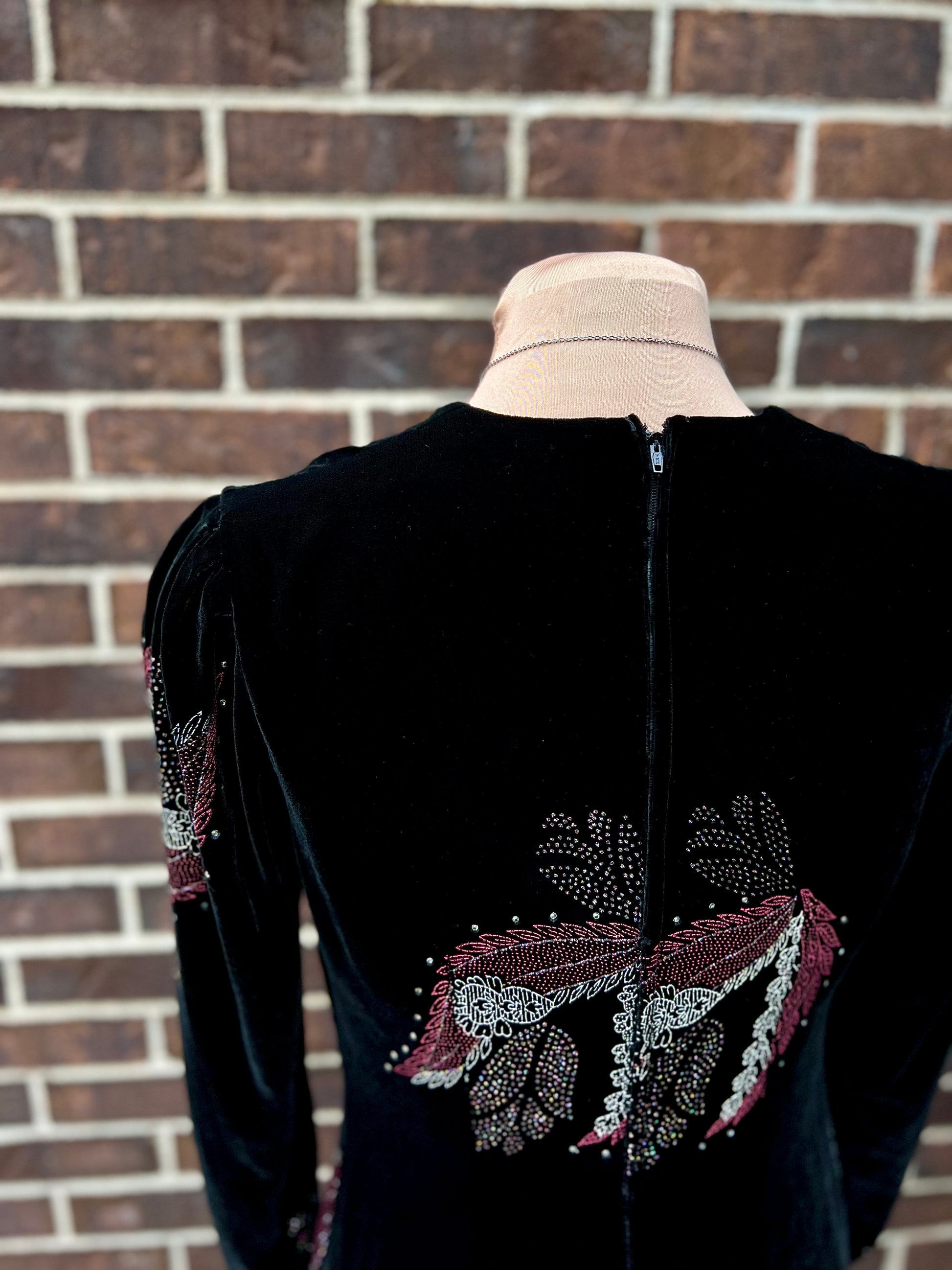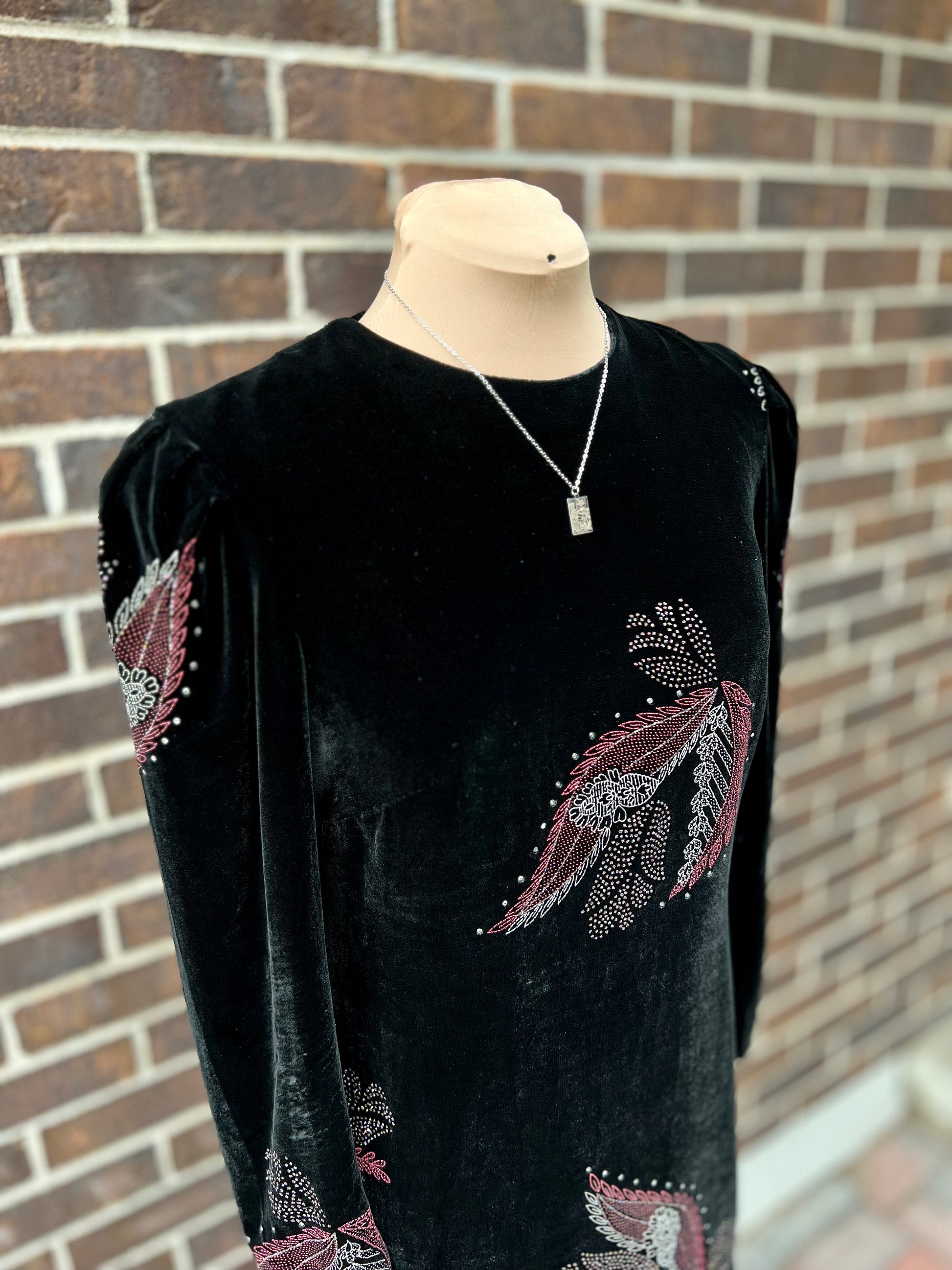 this incredible vintage mini dress is made of soft velvet. shift silhouette with subtle puff shoulders, long sleeves, and zip back. sparkly abstract leaf print in silvers and reds! a unique, dreamy piece that shows off your legs!